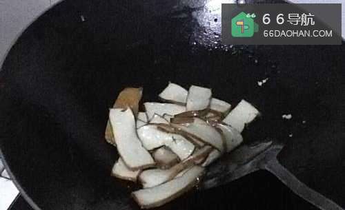6放入切好的熏豆干片,加入食用盐翻炒。