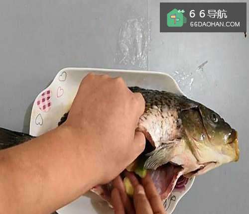 4再剩余的姜丝和葱段一起放进鱼的肚子里。