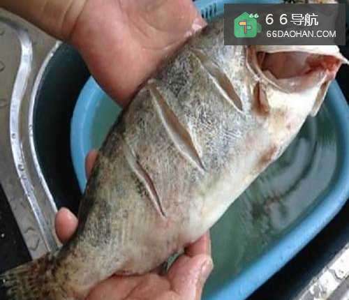 2将晾干水分的桂鱼放在砧板上,用刀在鱼背上划几刀,然后放入碗中。