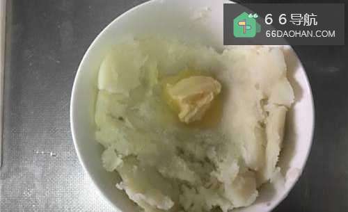 3将蒸熟的马铃薯放入碗中到捣成泥,加入适量盐和黄油,最后形成比较细腻的膏状。