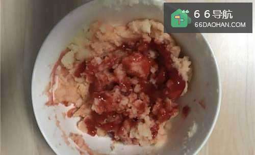 4加入适量番茄酱进行搅拌,直到颜色均匀,番茄酱分次加入,每次不要太多,注意口感,如果只是好看不好吃也是没有意义的。