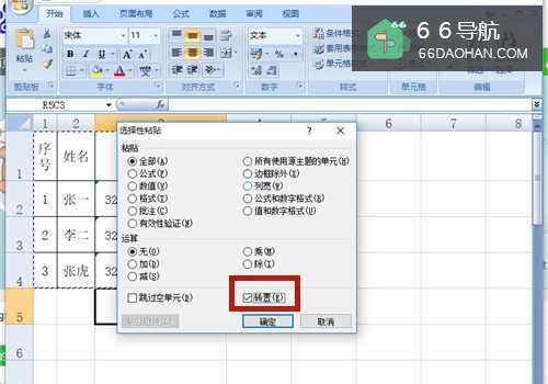4在【选择性粘贴】的对话框中,勾选【转置】。