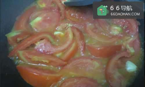 4锅中加油,加入蒜瓣炒熟后加入番茄和2颗冰糖,熬煮出番茄汁。