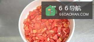 4锅中无需再倒油,直接将西红柿块入锅翻炒。