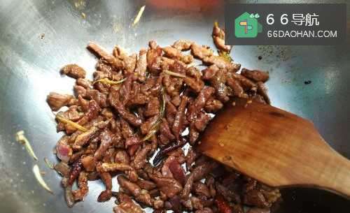 6快速翻炒肉丝,不要让其粘锅,然后依次加入适量鸡精、五香粉、胡椒,待肉炒变色后加入适量开水(加开水可以使肉口感更加酥软鲜嫩,避免肉被炒老口感生硬嚼不动的现象发生)