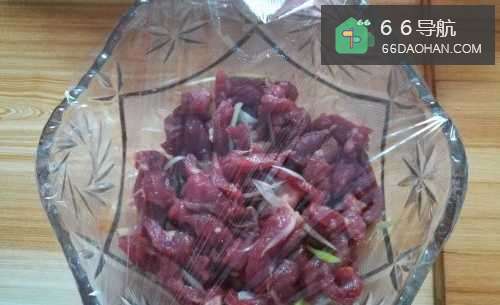 2往肉里加适量盐、花椒粉、生抽、淀粉,也可以往里加点葱丝哦,搅拌均匀后在放肉的碗上盖上保鲜膜腌半小时左右。
