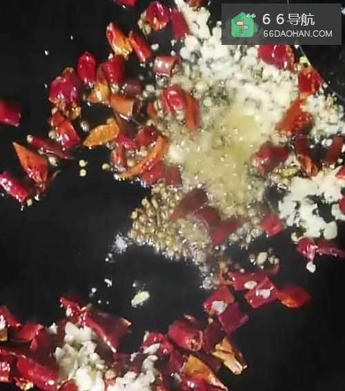 3另起锅,锅中放油,油温五成热时,放干辣椒,花椒,蒜末炒香。