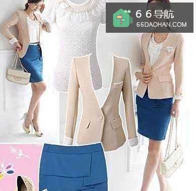 5卡其色休闲西服搭配蓝色短裙,很温柔简约的搭配,同时又不失时髦,是职场中很常见的一种搭配。