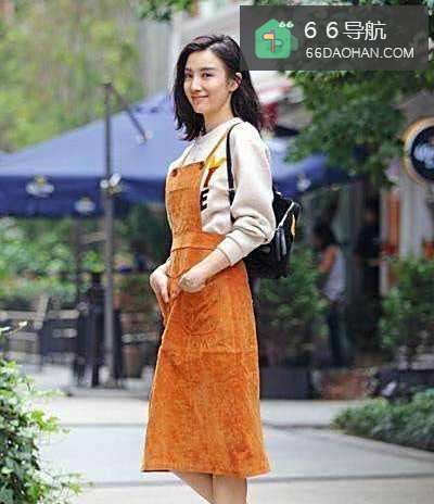 2橙色背带裙搭配卫衣,非常时尚的搭配,很能够给职场带来新鲜的感觉,给人很青春俏皮的感觉。