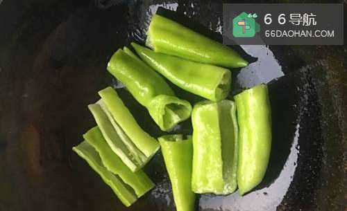 44、烧干炒锅放油,热油放入尖椒,要不时的翻炒一下。
