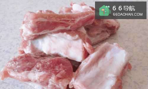 2.排骨洗净,剔去多余的油脂、血块,用厚背厨刀剁成6cm左右的小段