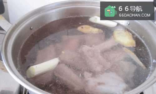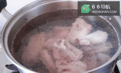 6焯水的排骨,放入汤锅中加入适量的清水,烧开后撇去血沫。