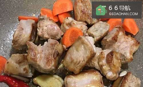 3加入红萝卜块翻炒,使之均匀裹上油