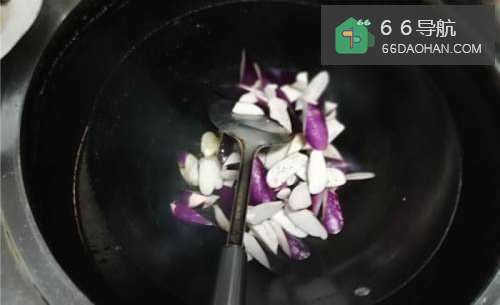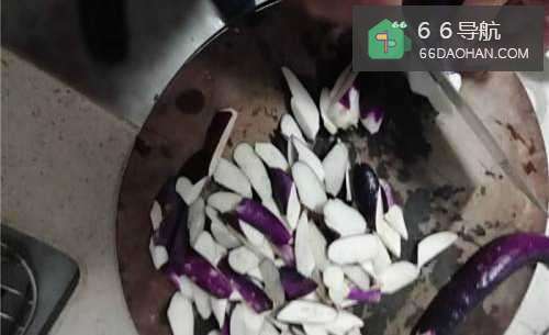 6然后再把切好的茄子放入锅中,开始翻炒,加入适量的盐和酒。
