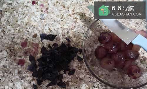 2将葡萄洗净,去皮去籽,切成两半盛入碗中。
