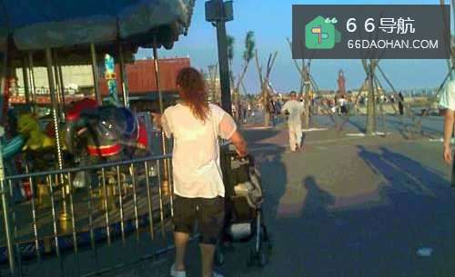 2用推车推幼儿就要和妈妈一起来观赏,游玩的项目就是平地旋转的的游览车。