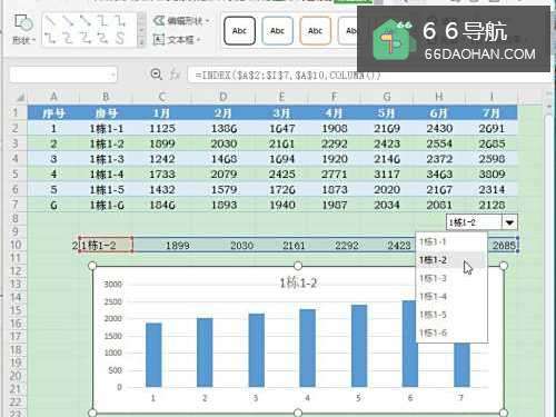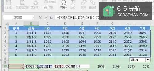 5在【B10】单元格输入公式=INDEX($A$2:$I$7,$A$10,COLUMN()),设置函数公式进行数据匹配,然后按CTRL+R,向右填充数据;