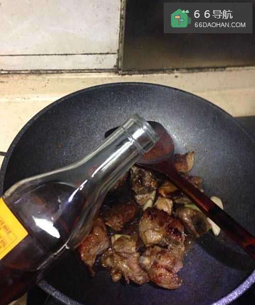 6冒黄色的泡沫后立即把沥干水的排骨放入锅中翻炒,这步叫上糖色。