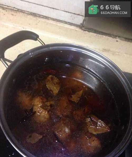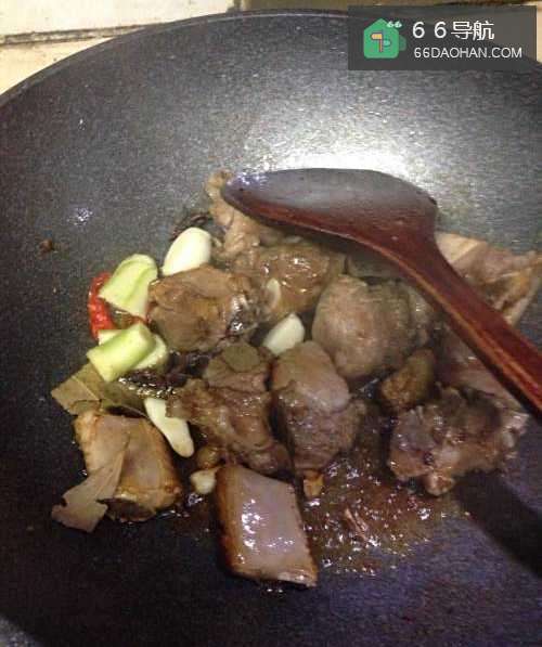 9翻炒的时候用小锅接上半锅冷水,把炒好的排骨整锅倒入小锅里面。