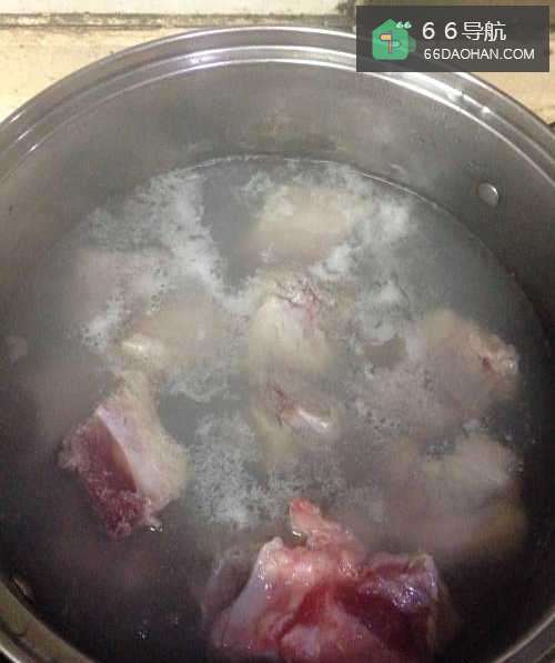 2把洗好的排骨放入烧开的水中,煮三分钟左右,煮出泡沫来,把水倒掉。