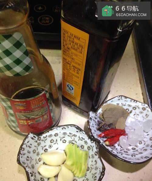 3同时把姜、蒜洗净切好备用;拿两个八角,三、四片香叶,一个干辣椒、十颗只左右冰糖备用;料酒、酱油备用。