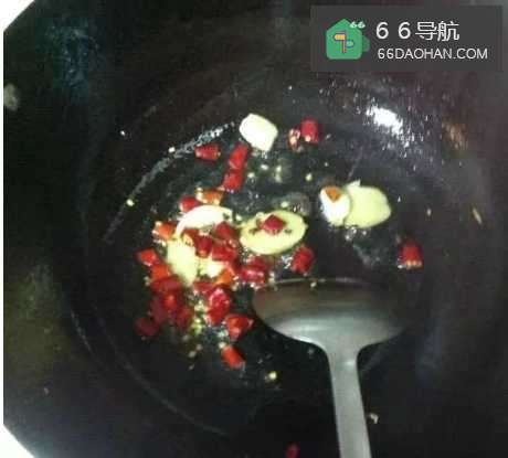 跟姜片蒜瓣一起爆香,干辣椒多一些,依自己能接受的辣度来放,切成小段,放入锅内。