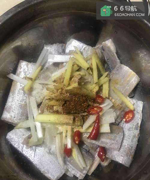 4将所有处理好的带鱼放入盆中沥干水分,倒入一点白酒,生姜丝,大葱丝,小米椒切段,盐,糖少许,胡椒粉少许