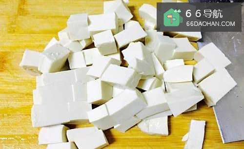 首先把豆腐清洗干净之后切成正方形的小丁状,然后与冷水一起下锅,撒上一点盐,开大火烧开。
