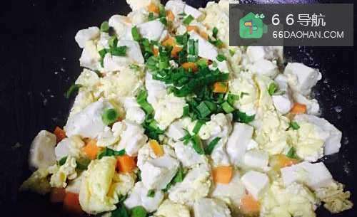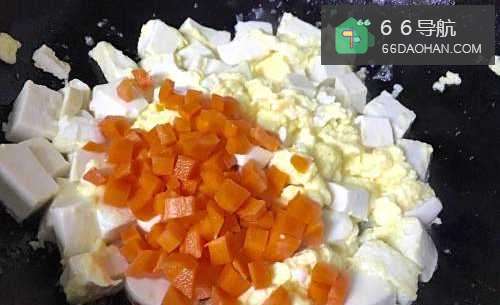 5蛋液都凝固之后,把胡萝卜丁倒进去,继续轻轻的翻炒,这时候豆腐会稍微出水,如果加的是火腿肠就不需要额外加水了,我加的是胡萝卜丁,所以加了半碗水,盖上锅盖焖煮一下!