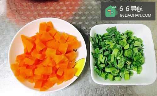 3接下来把胡萝卜切成丁,葱花切好备用。