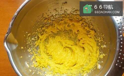 22、接着再把2个蛋黄分2次倒入黄油盆子内,每加入一次都要彻底搅打均匀,再加入下一次