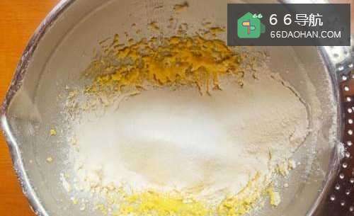 33、然后把中筋面粉和泡打粉一起过筛到盆子内,戴上一次性防粘手套,将其混合均匀,混合到看不见干粉即可