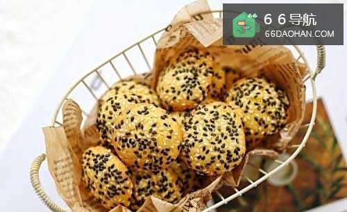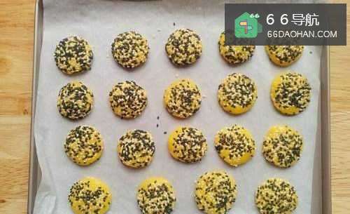 66、将分割好的面团表面均匀的沾满黑白芝麻,然后再用手按扁,所有的面团都依次弄好后,摆放在烤盘内,烤盘最好事先垫上油纸防粘,最后送入预热好的烤箱中层,上下火165度烤15分钟左右