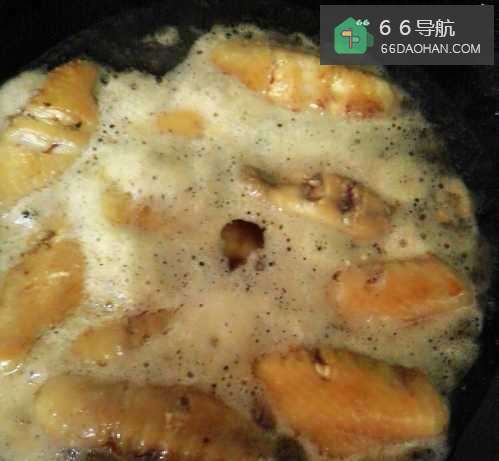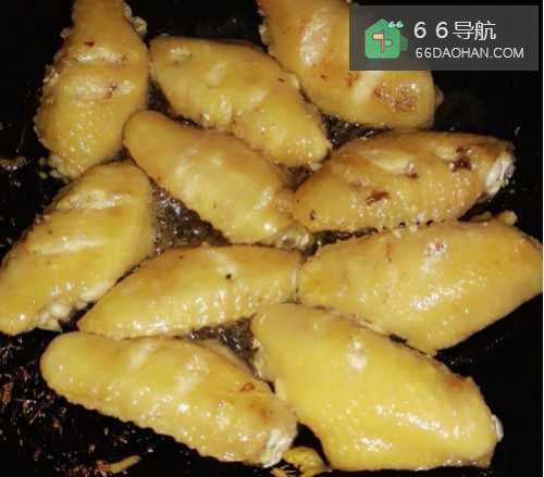 3把腌好的鸡中翅放入锅里小火煎散沃散,油不要放太多了,一直煎至两面金黄色为止。