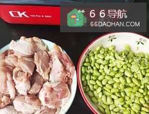 鸡腿切块泡去血水沥干,500克毛豆剥好备用。