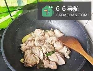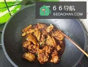 3下入鸡腿煸炒至全部变白放入2大勺料酒。