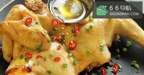 6最后把鸡装盘,撒上小米椒,把锅中的热油淋在鸡肉上面即可;