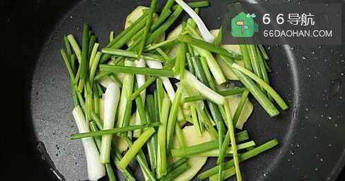 3锅内刷一层油,先铺上姜片,再铺上葱段;