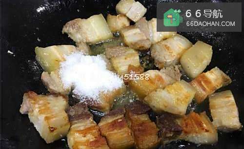 7两面煎金黄之后,放入白糖快速翻炒几下。