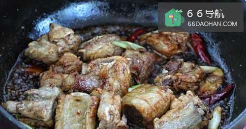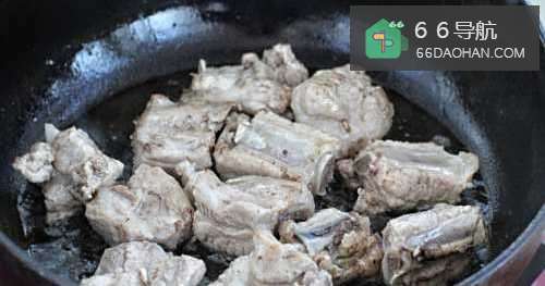 5起油锅烧热,放入排骨翻炒至变色断生状态。