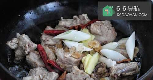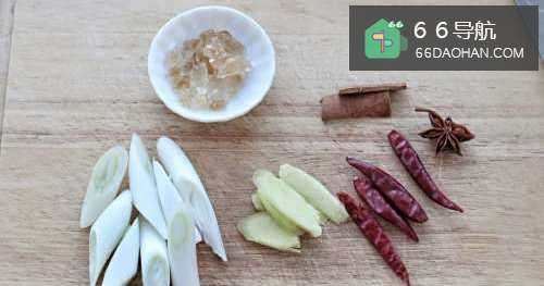 6放入葱、姜、八角、桂皮、红干椒和冰糖,翻炒至冰糖融化。