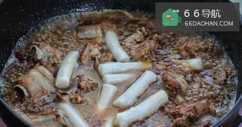 8添入清水没过排骨,大火煮沸后改中小火炖煮约一小时,将年糕放进去。