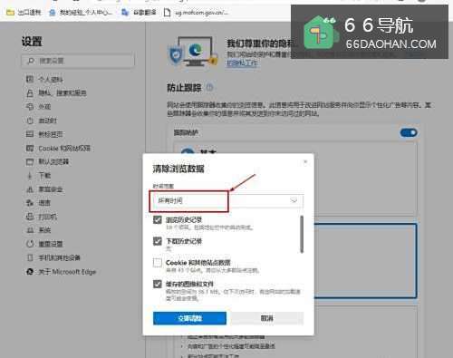 3在“清除浏览数据”窗口,选择【时间范围】→【所有时间】;