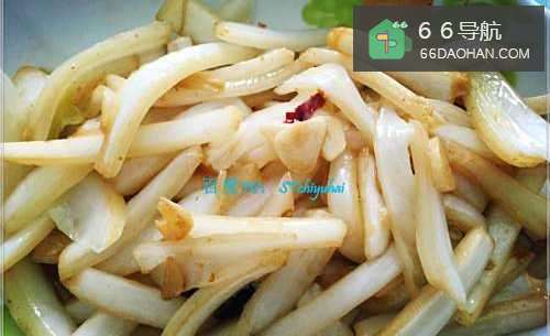 2去除蒂头,然后将茎层层剥开,放入清水中仔细清洗,然后沥干,沿着竖直方向切成丝条状。