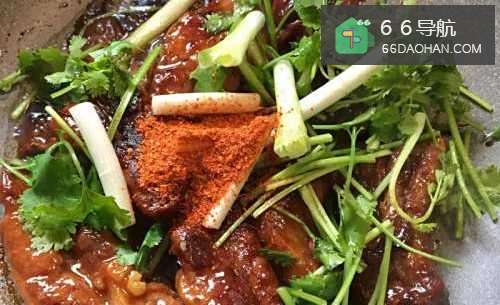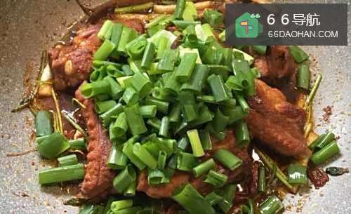 5等到酱汁稍稍收干时放入辣椒粉,香菜和葱白拌炒均匀