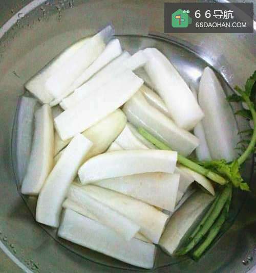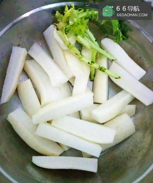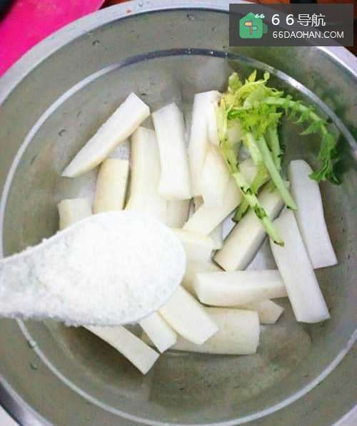 2将萝卜切条,差不多2厘米粗,每一块肉上面都必须带有萝卜皮,如果细了或是没有皮,腌制后的脆度就不够了。