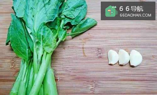 5热锅倒油,先放入一半的蒜末爆香,然后倒进芥兰杆略炒一下,随即再下入叶子一同翻炒。