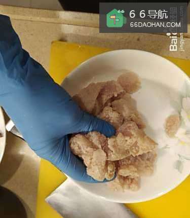 5最后在裹好炸鸡粉的鸡丁块里撒上些盐,然后用手把所有鸡肉搅拌至鸡肉均匀裹上盐。