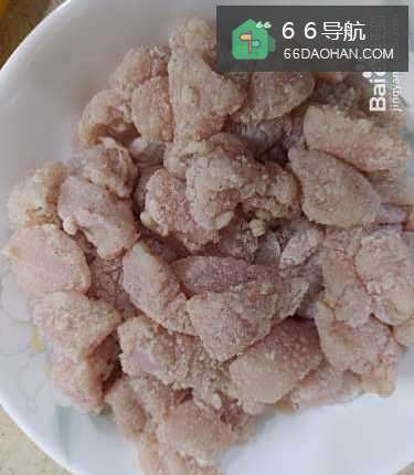 4把事先切好的鸡丁块依次放入炸鸡粉中,把鸡丁块全身都裹上炸鸡粉。