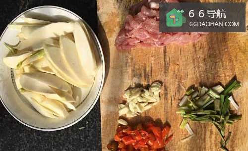 首先我们将高笋切成薄片,再将猪肉切块,酸辣椒、蒜头、蒜叶切碎装盘待用。